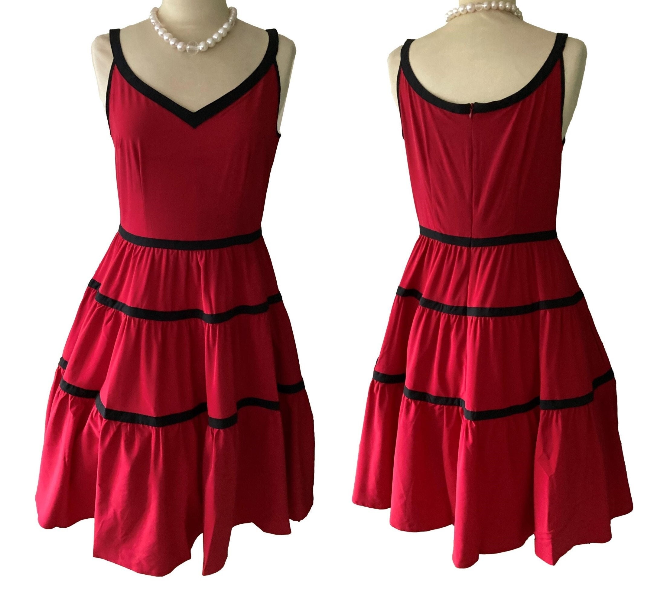 Uk 12 14 50s Red Black Tiered Vintage 50s Dress Swing Retro Etsy